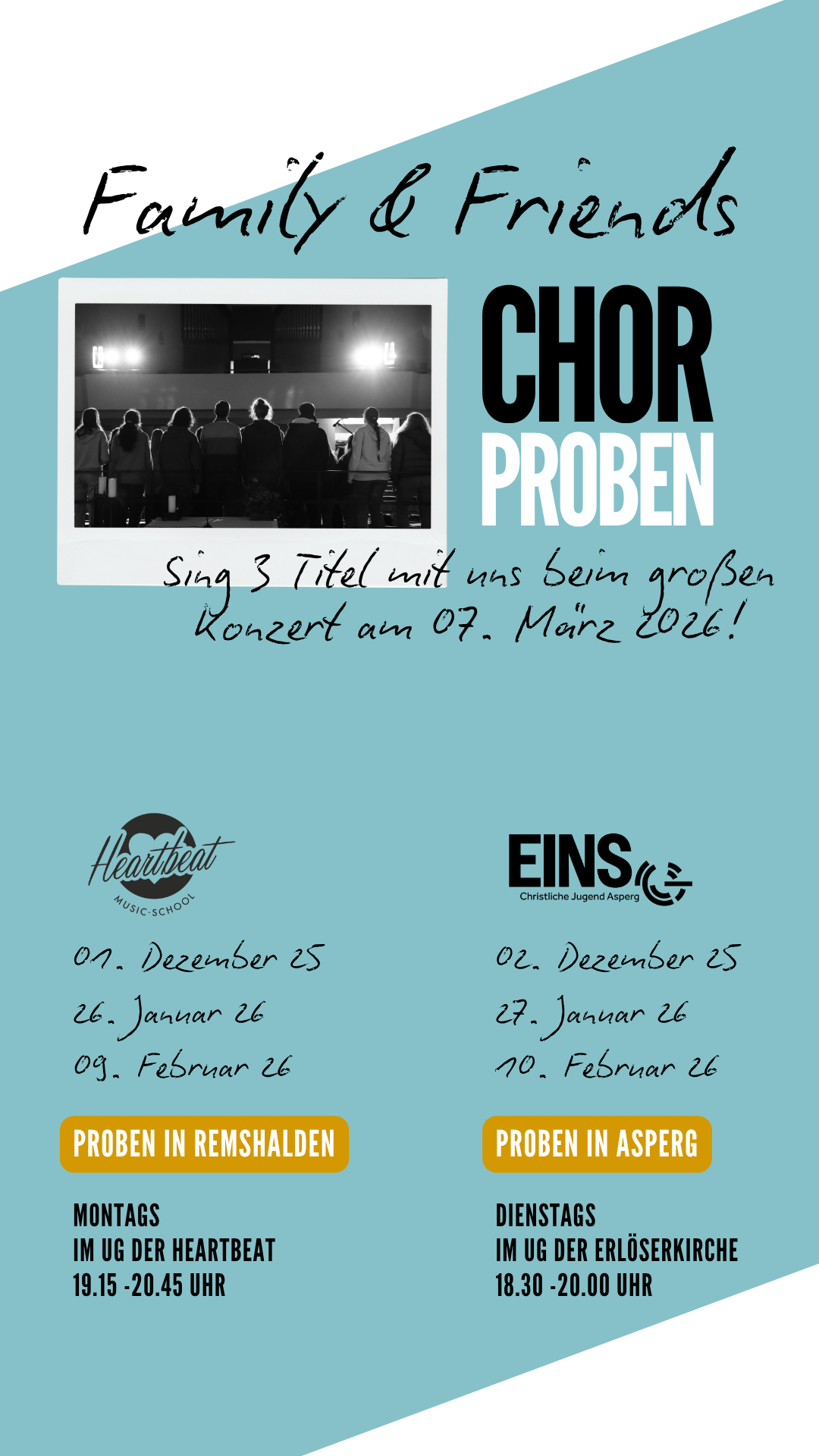 EMK Wilhelmstr. 14/1, Asperg, GermanyProben regulär dienstags, 18.30 Uhr - 20.00 Uhr Wilhelmstr. 14/1, 73679 Asperg Proben special 06.- 08.02. - Chor WE 05.03. - Hauptprobe 06.03. - Generalprobe 16.03. - Abschlussabend Abschlusskonzert am 7. März 2026